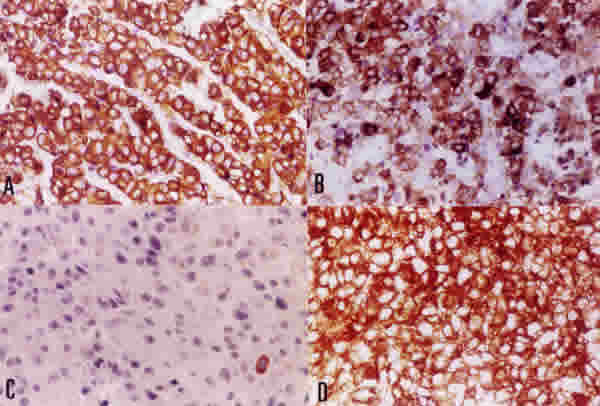 Fig. 1: Las imágenes corresponden a un adenoma secretor de FSH (A, B) y un adenoma productor de ACTH (C, D). A y C son tinciones inmunohistoquímicas frente a Cromogranina A. Destaca la fuerte inmunoreactividad para cromogranina A en el adenoma secretor de FSH (A), comparado con las escasas células positivas en el adenoma ACTH (C). Cortes de parafina con hematoxilina, x 400 aumentos.